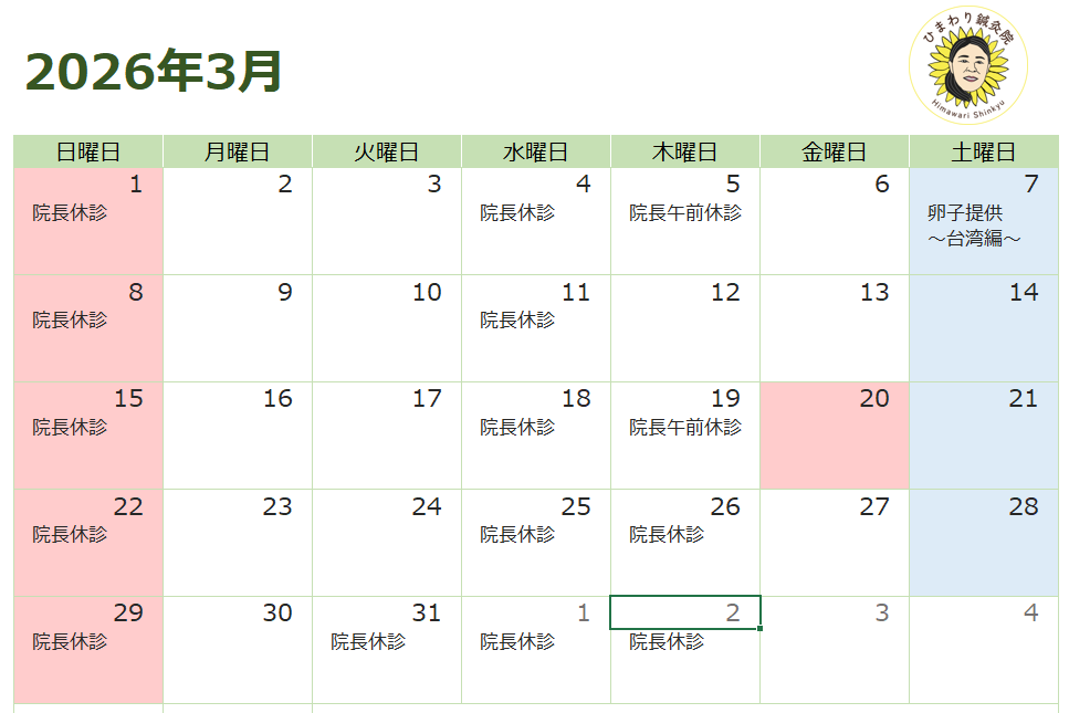 小玉院長の3月休診日です定休日の毎週水曜と日曜、第1・3木曜日の午前中に加えて26日(木)と31日(火)があります。
