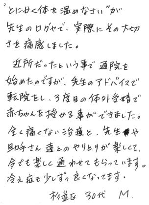 来院前の病院での治療が良い結果でなく、気持ちがしずまれている感じでした。年齢が30代なので、自宅での体のケアもがんばって病院も転院されれば結果は早くでると思っていましたがその通りになりました。現在も順調で良かったです。