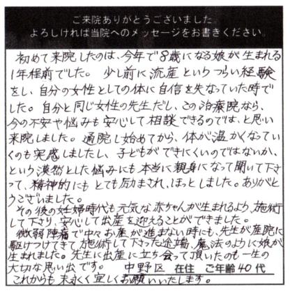 初めて来院したのは、今年で8歳になる娘が生まれる1年程前でした。少し前に流産というつらい経験をし、自分の女性としての体に自信を失っていた時でした。自分と同じ女性の先生だし、この治療院なら、今の不安や悩みも安心して相談できるのでは、と思い来院しました。通院し始めてから、体が温かくなっていくのも実感しましたし、子どもができにくのではないかという漠然とした悩みにも本当に親身になって聞いて下さって、精神的にもとても励まされ、ほっとしました。ありがとうございました。