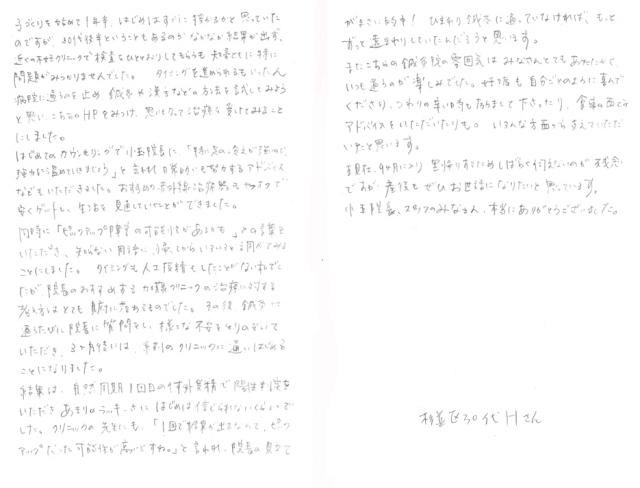 またこちらの鍼灸院の雰囲気はみなさんとてもあたたかく、いつも通うのが楽しみでした。妊娠も自分ごとのように喜んでくださり、つわりの辛い時も励まして下さったり、食事の面でのアドバイスをいただいたりも。いろんな方面から支えていただいたと思います。現在9ヶ月に入り、里帰りするためしばらく伺えないのが残念ですが、産後もぜひお世話になりたいと思っています。
