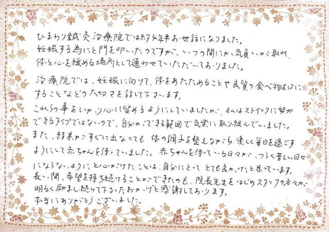 また、結果がすぐに出なくても体の調子を整えながら楽しく毎日を過ごすようにして赤ちゃんを待っていました。赤ちゃんを待っている日々が、辛く、苦しい日々にならないようにと心がけてたことは、自分にとってとても良かったと思っています。