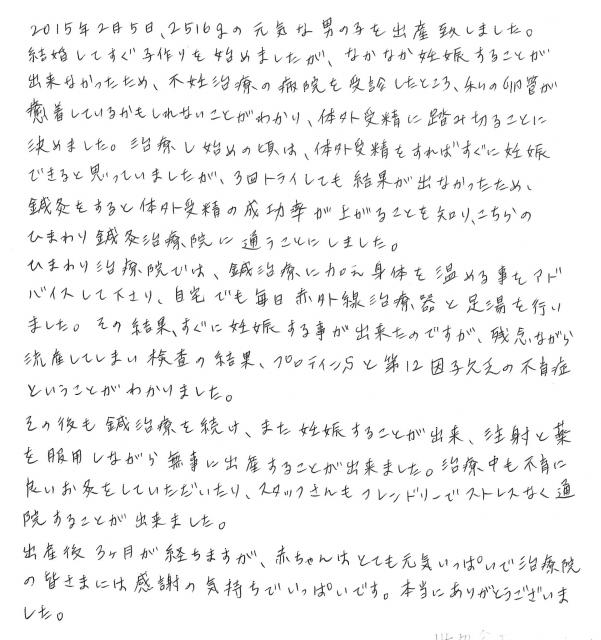 ひまわり治療院では、鍼治療に加え身体を温める事をアドバイスして下さり、自宅でも毎日赤外線治療器と足湯を行いました。その結果、すぐに妊娠することが出来たのですが、残念ながら流産してしまい検査の結果、プロテインSと第12因子欠乏の不育症ということがわかりました。