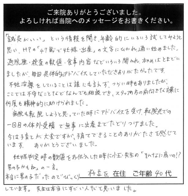 「鍼灸がいい」という情報を聞き、年齢的にいろいろ試してみようと思い、HPの「47歳で妊娠・出産」の文字にひかれ、通い始めました。